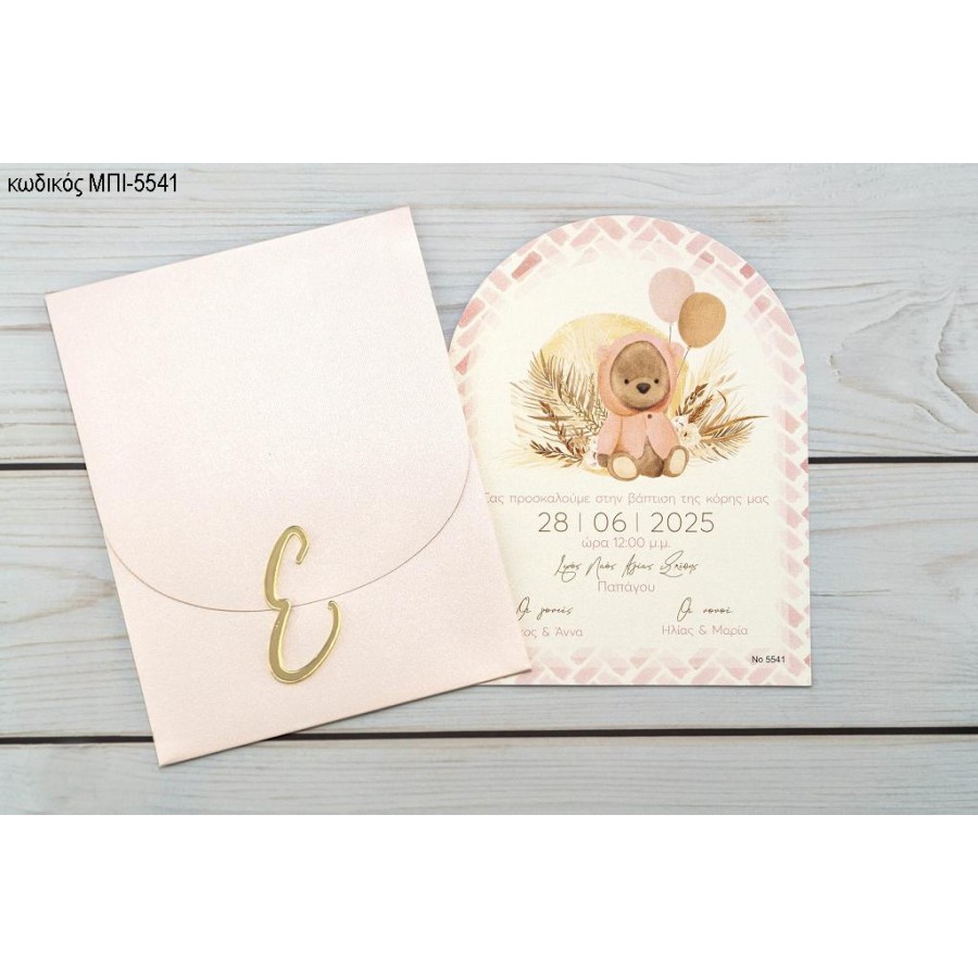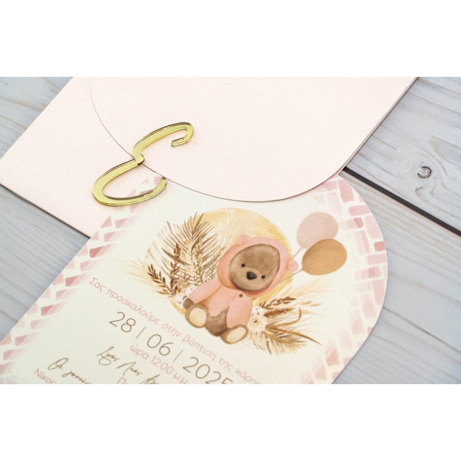 ΠΡΟΣΚΛΗΤΗΡΙΟ ΒΑΠΤΙΣΗΣ ΑΡΚΟΥΔΑΚΙ ΜΕ ΜΠΑΛΟΝΙΑ ΣΕ ΦΑΚΕΛΟ ΡΟΖ ΜΕΤΑΛΛΙΖΕ ΜΠΙ-5541