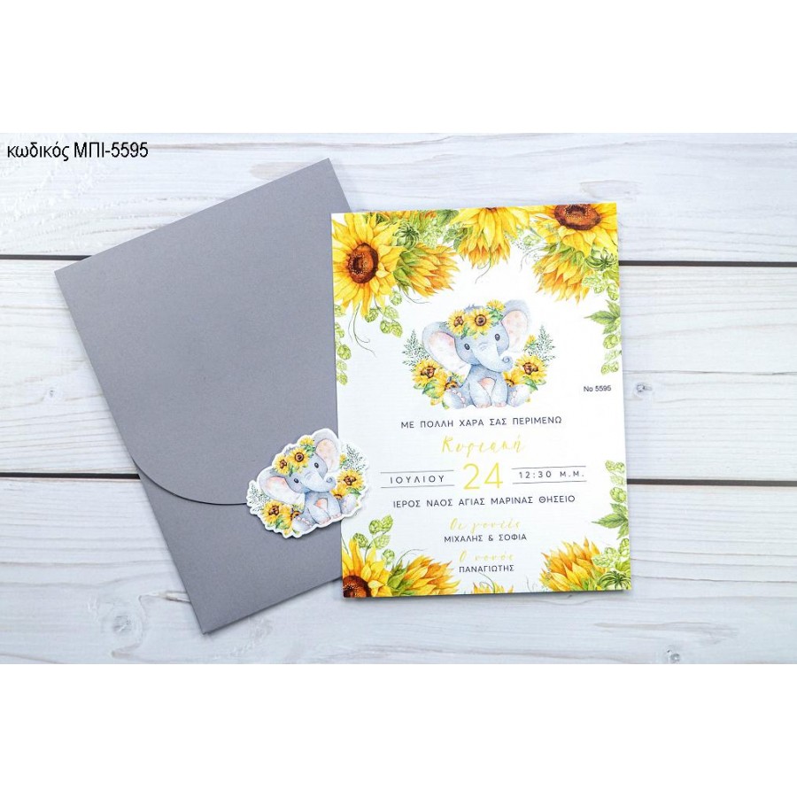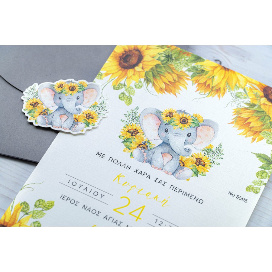 ΠΡΟΣΚΛΗΤΗΡΙΟ ΒΑΠΤΙΣΗΣ ΕΛΕΦΑΝΤΑΚΙ ΜΕ ΛΟΥΛΟΥΔΙΑ ΗΛΙΟΥΣ ΣΕ ΦΑΚΕΛΟ ΓΚΡΙ ΜΠΙ-5595