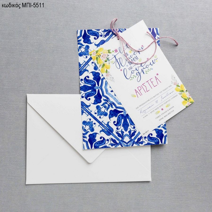 ΠΡΟΣΚΛΗΤΗΡΙΟ ΒΑΠΤΙΣΗΣ ΜΟΤΙΒΟ ΜΠΛΕ ΚΑΙ ΛΟΥΛΟΥΔΙΑ ΚΙΤΡΙΝΑ ΣΕ ΦΑΚΕΛΟ ΛΕΥΚΟ ΜΠΙ-5511