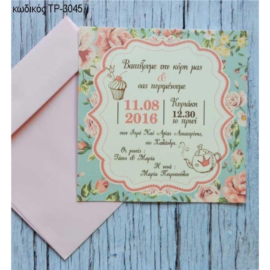 ΠΡΟΣΚΛΗΤΗΡΙΟ ΒΑΠΤΙΣΗΣ ΤΡΙΝΤΑΦΥΛΛΑ ΡΟΖ VINTAGE ΣΕ ΦΑΚΕΛΟ ΡΟΖ ΧΡΩΜΑ ΤΡ-3045