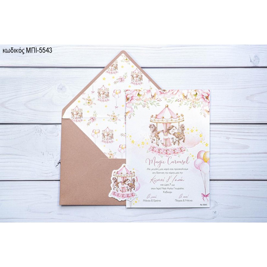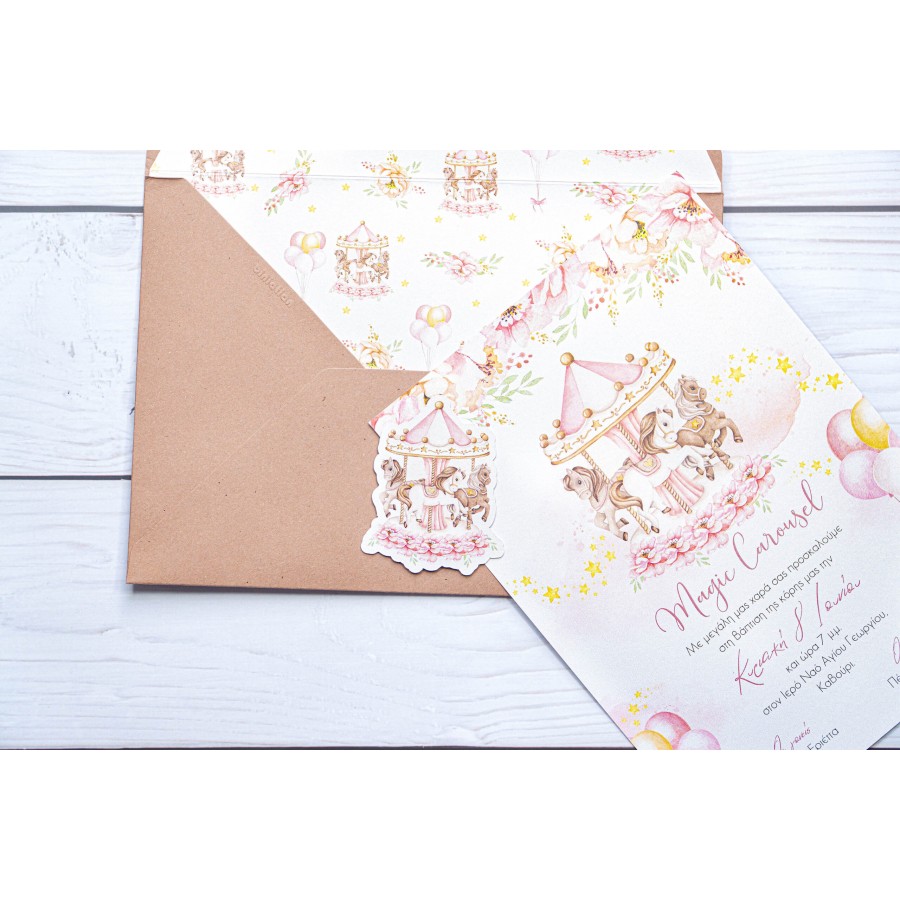 ΠΡΟΣΚΛΗΤΗΡΙΟ ΒΑΠΤΙΣΗΣ ΜΕ CAROUSEL ΡΟΖ ΣΕ ΦΑΚΕΛΟ ΡΟΖ ΜΕ ΙΔΙΟ ΣΧΕΔΙΟ ΜΠΙ-5543
