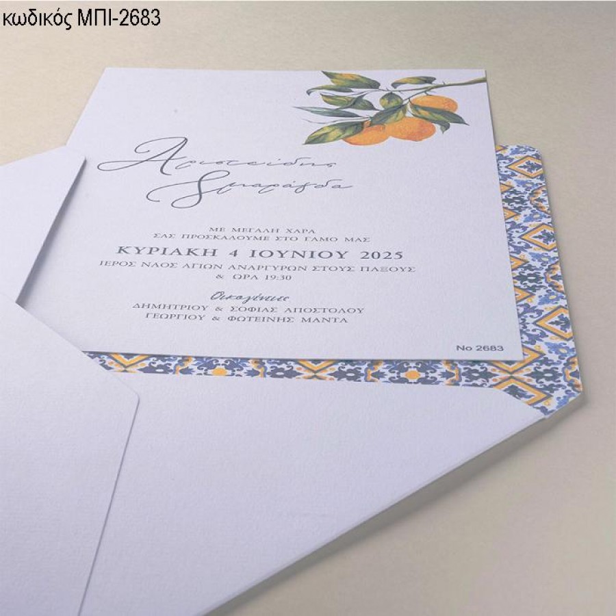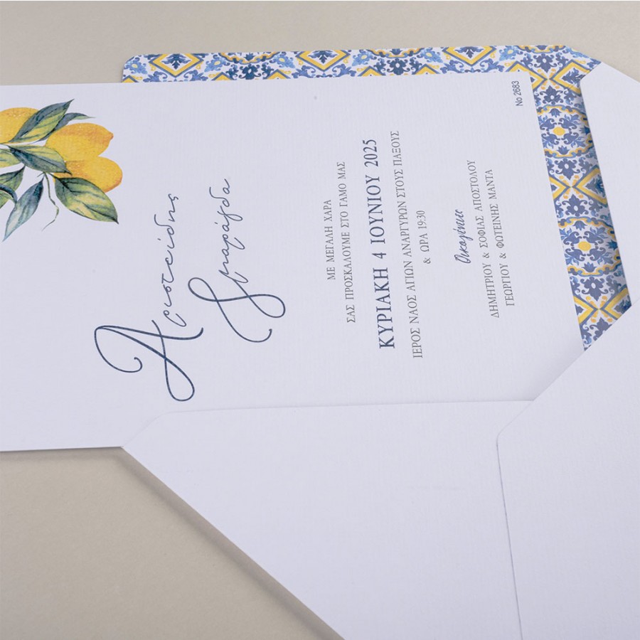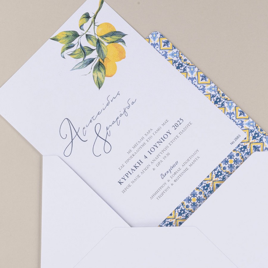 ΠΡΟΣΚΛΗΤΗΡΙΟ ΓΑΜΟΥ ΜΕ ΛΕΜΟΝΙΑ ΣΕ ΦΑΚΕΛΟ ΜΕ ΜΠΛΕ ΚΙΤΡΙΝΟ ΜΟΤΙΦ ΜΠΙ-2683