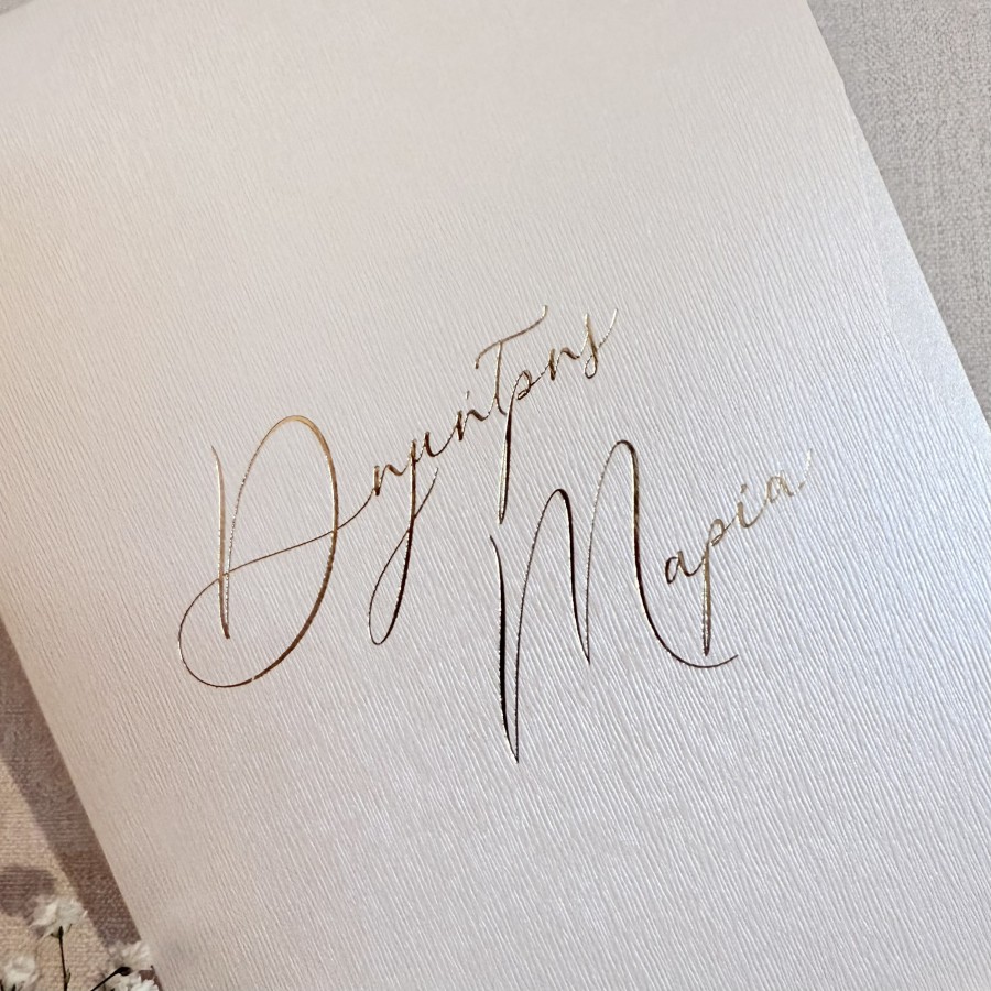 Ο φάκελος είναι χαρτί ιβουάρ μεταλιζέ γκοφρέ με ιδιαίτερη υφή 300γρ