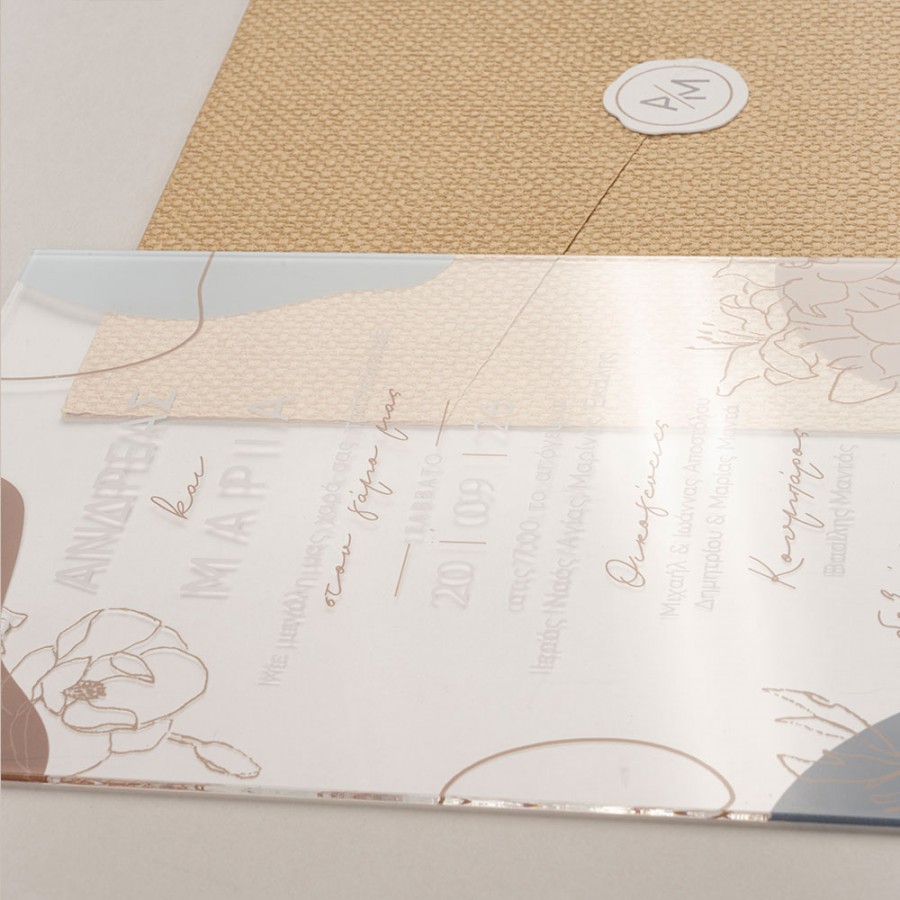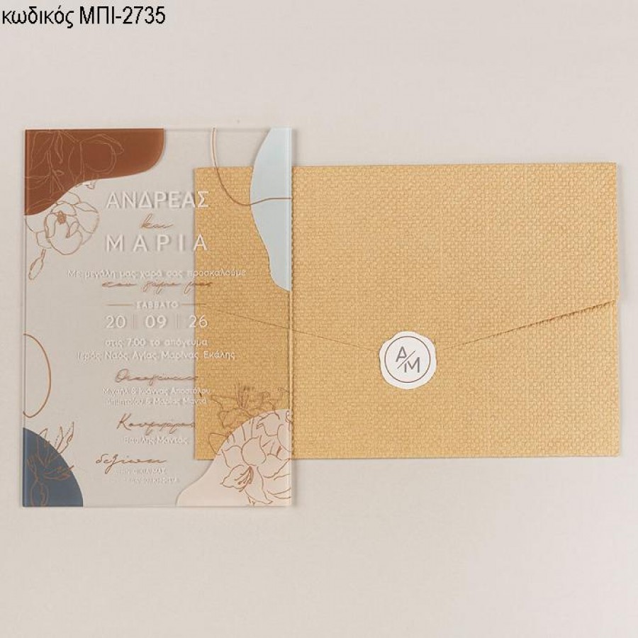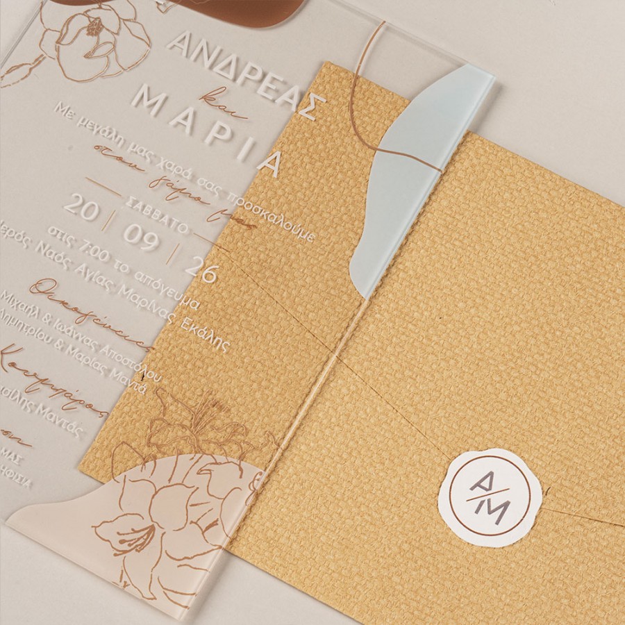 ΠΡΟΣΚΛΗΤΗΡΙΟ ΓΑΜΟΥ PLEXIGLASS ΔΙΑΦΑΝΟ ΜΕ ΛΟΥΛΟΥΔΙΑ ΣΕ ΦΑΚΕΛΟ ΓΚΟΦΡΕ ΛΕΥΚΟ ΜΠΙ-2735