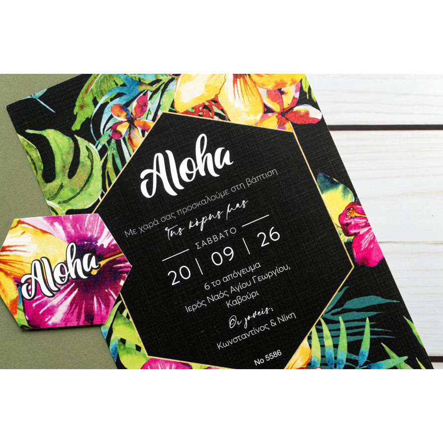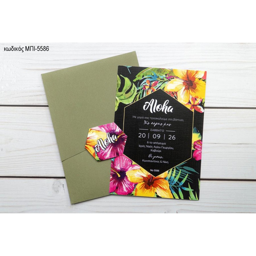 ΠΡΟΣΚΛΗΤΗΡΙΟ ΒΑΠΤΙΣΗΣ ALOHA ΜΕ ΕΝΤΟΝΑ ΧΡΩΜΑ ΣΕ ΦΑΚΕΛΟ ΠΡΑΣΙΝΟ ΜΠΙ-5586